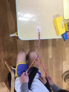 指先を使って3本がほどけないようにしながら、色の順番も守って、たくさんの事を考えながらする作業に、子ども達もとっても真剣そのものでした。