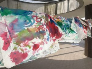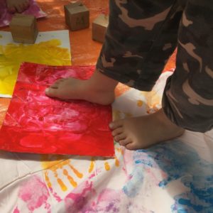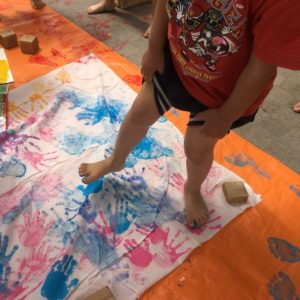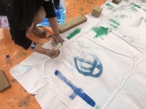 今日は大きな布に絵の具で模様をつけました!汚れてもいい服の準備のおかげで、いつもより少し、伸び伸びと活動することができました♩