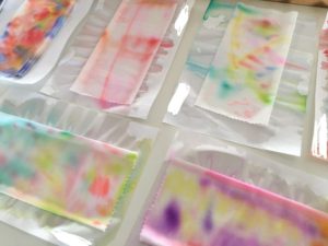 水彩ペンで描いて、霧吹きで水をシュッ!すると、模様が滲んでとても綺麗になりました。これが何になるのかはお楽しみです☆