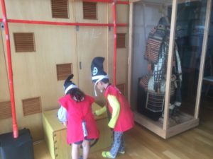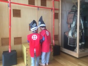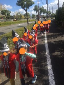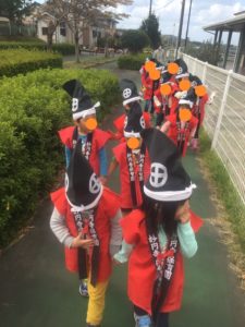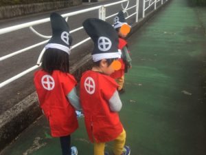 僕たちも!私たちも!ということで、にじ組とかぜ組で陣羽織を身にまとって子ども園の神社まで歩きましたよ♪