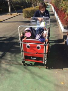 つき組のお友達は、お散歩ロープに掴まって、ゆめ組のお友達は散歩カーに乗って行きましたよ。