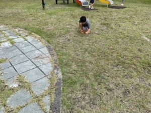 何かを見つけてしゃがみ込むお友達。