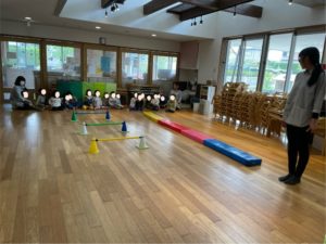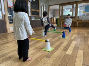 お部屋の中でリトミックや、平均台をして