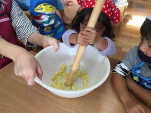 エプロンに着替えるとウキウキなそら組さん!気合い十分でお団子作りをしました。まずはお芋を潰します。両手でしっかり持って潰していきました。