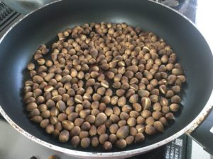 「食べた~い!」という声が。水につけて、浮いてきたものは、よけてから、しっかり洗って、水を切った椎の実をフライパンで乾煎りしました。