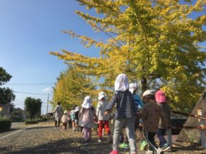葉っぱも鮮やかに色付いて、匂いや音、感触も楽しみながら楽しくこども園に帰ることができました。
