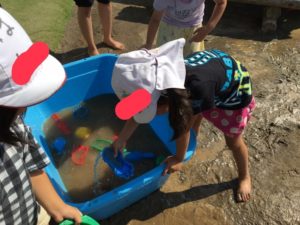 そうめん流しだー!と水の流れ道を作ったり、、
