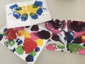 “デカルコマニー”と言う方法で作りました。 絵の具を半分にだけつけて、