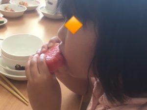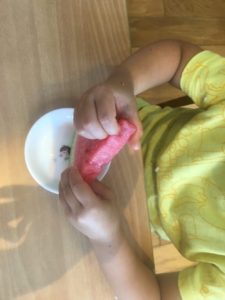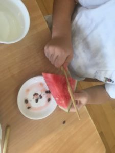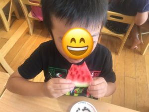 そして、今日の果物は「スイカ」でした!桃のお絵かきをしていると、「今日の果物は何かな?」とワクワクしている姿がありました。