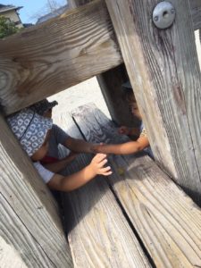 他には、イチョウの葉っぱも見つけて、遊具の下で「いらっしゃいませ〜」「ありがとうございました〜」とお店やさんも開かれていましたよ♩