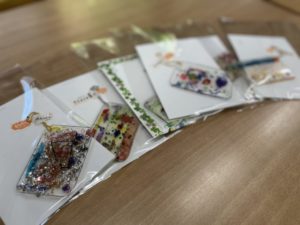 「キラキラキーホルダーとメッセージカード」
