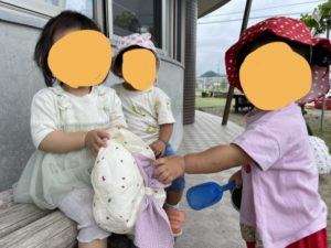 「どうぞ♩」とお友達に帽子を渡してくれる