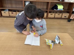 皆で紙飛行機作りです。