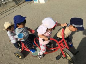 以上児園庭では、お友達と協力しながら二人乗り自転車に乗ったり🤝