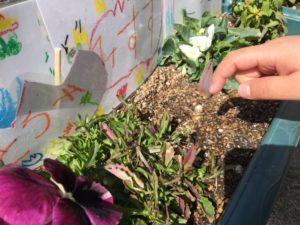 こっちにはみんなが育てているチューリップの芽が少しずつ顔を出し始めましたよ!
