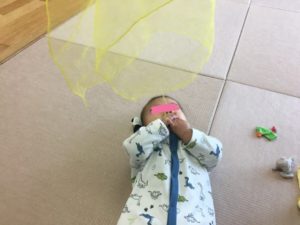 寝転がってオーガンジーを上からひらひらと落とすと、ニコッと笑って手足を大きく動かしていましたよ。