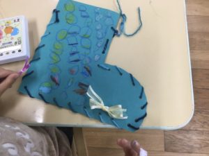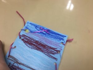 毛糸を使って紐通しは、時間がたくさん必要でしたが、自分の力で最後までがんばりました!