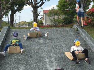 坂がある公園なので、事前に段ボールで手作りのソリを作り持っていきました☆