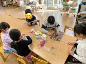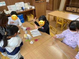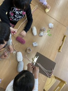 紐を編んで作るキーホルダー作り。