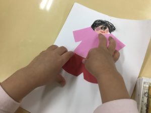 全身を描く練習で、洋服は糊で貼り、腕、足、顔をクレヨンで描きました!