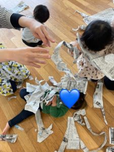 今日はつき組さん、ゆめ組さん一緒に新聞紙遊びをしました。