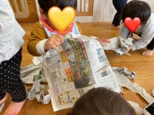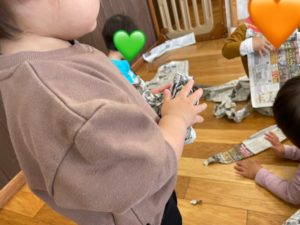 保育者が新聞紙を破くと、”楽しそう!"とキラキラした目を向ける子ども達(^^)