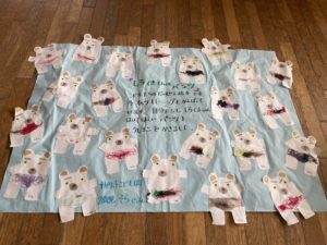大好きな絵本を見て、自分たちもクレヨンでパンツに模様を描き、しろくまくんに履いてもらいました。2月に郵便局に飾ってもらいます。ご用の際は、是非ご覧になってくださいね。