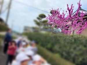 最初は名前がわからなかったので、園長先生に聞いてみると、「ハナズオウ」だと教えてもらいました。