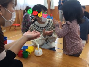 最後は、マラカスやスズを手に持ち、みんなでおもちゃのチャチャチャ🎵の歌に合わせて、楽器あそびをしていました😍