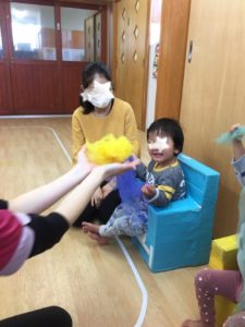 また、シフォン布あそびでは、「ジージーバァ」と顔隠したり手に握ったり、柔らかく肌触りいいシフォン布の感触を楽しみました🤗