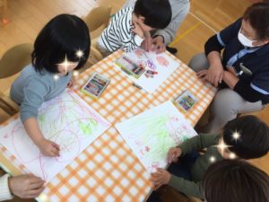自由画製作では色とりどりのクレヨンで、好きなように絵柄を描いていました👏
