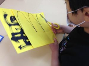 黄色い紙に、黒のクレヨンでなぐり書きをしたものに、