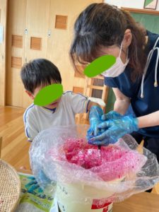 今日は、梅と赤シソを別の容器に分ける手仕事をお手伝いしてくれました。