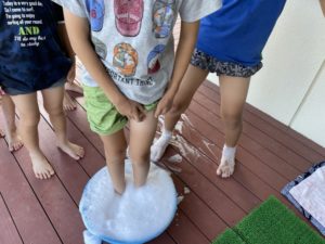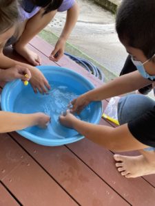 手作りの水鉄砲やたらいを使って