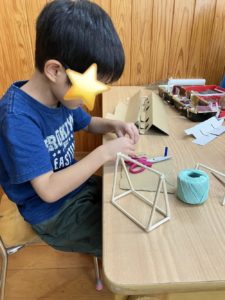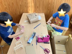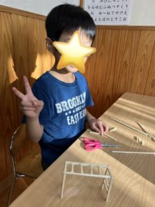 ミニチュア公園の遊具作りを張り切っています。