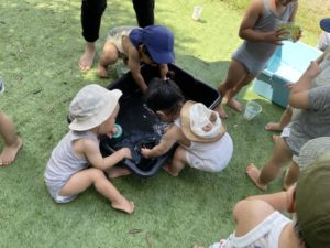 たらいに水が入ると待ちに待った水遊びタイム! 水面を叩いて水しぶきをあげたりカップで水をすくってこぼしたり水遊びを思いっきり楽しみました。つき組のお友達の遊ぶ様子をみて真似っこして遊ぶお友達もいましたよ。