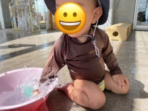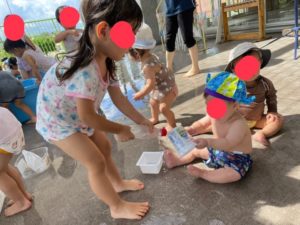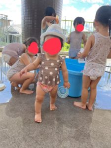 今日は2階のテラスへ行って水遊びをしました。