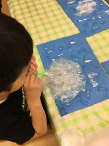 青い画用紙に白い絵の具を混ぜたしゃぼん液。