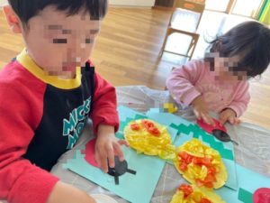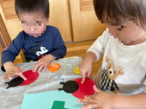 「てんとうむしを、のりでぺったんしたの〜♪」