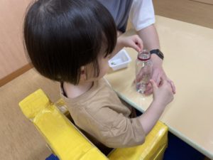 指先でつまみながら上手にキラキラ(スパンコール✨)を容器の中に入れてますね。
