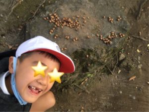 先週、大量に集めて干しておいたどんぐりを見て、満足気な男の子✨