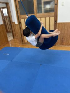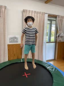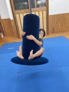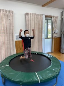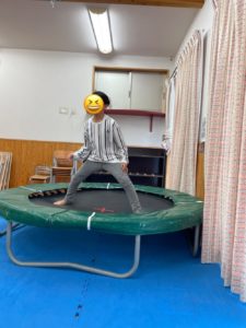 今日も室内スポーツ玩具(トランポリンと筒型のスイング)で