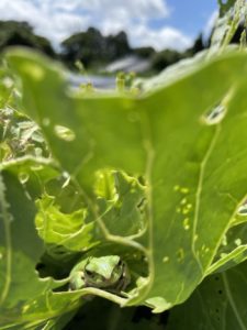 葉の陰で涼むカエルの姿を見つけました。