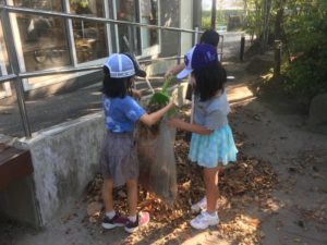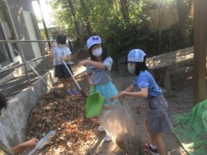 池の周りの落ち葉を集めたり、