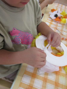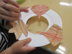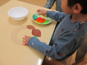 2歳児グループは、葉っぱを紙皿に飾りつけ☆