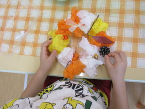 年中・年長グループでは、花紙と季節のドングリや葉っぱ、