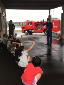 近くで見る消防車に喜びながら、質問もたくさんしていました。
