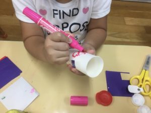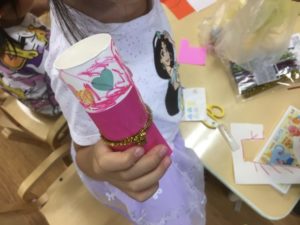 折り紙を貼ったり、ハートのシールで飾り付けをしたり、キラキラのモールを結んだり、材料からイメージを広げて製作していく姿がありました♩