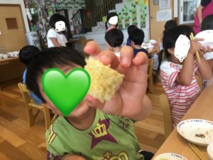 みんなで収穫し、皮を剥いて給食室の先生にに茹でてもらいました♩