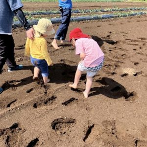 農場で裸足になると、土を踏みながら